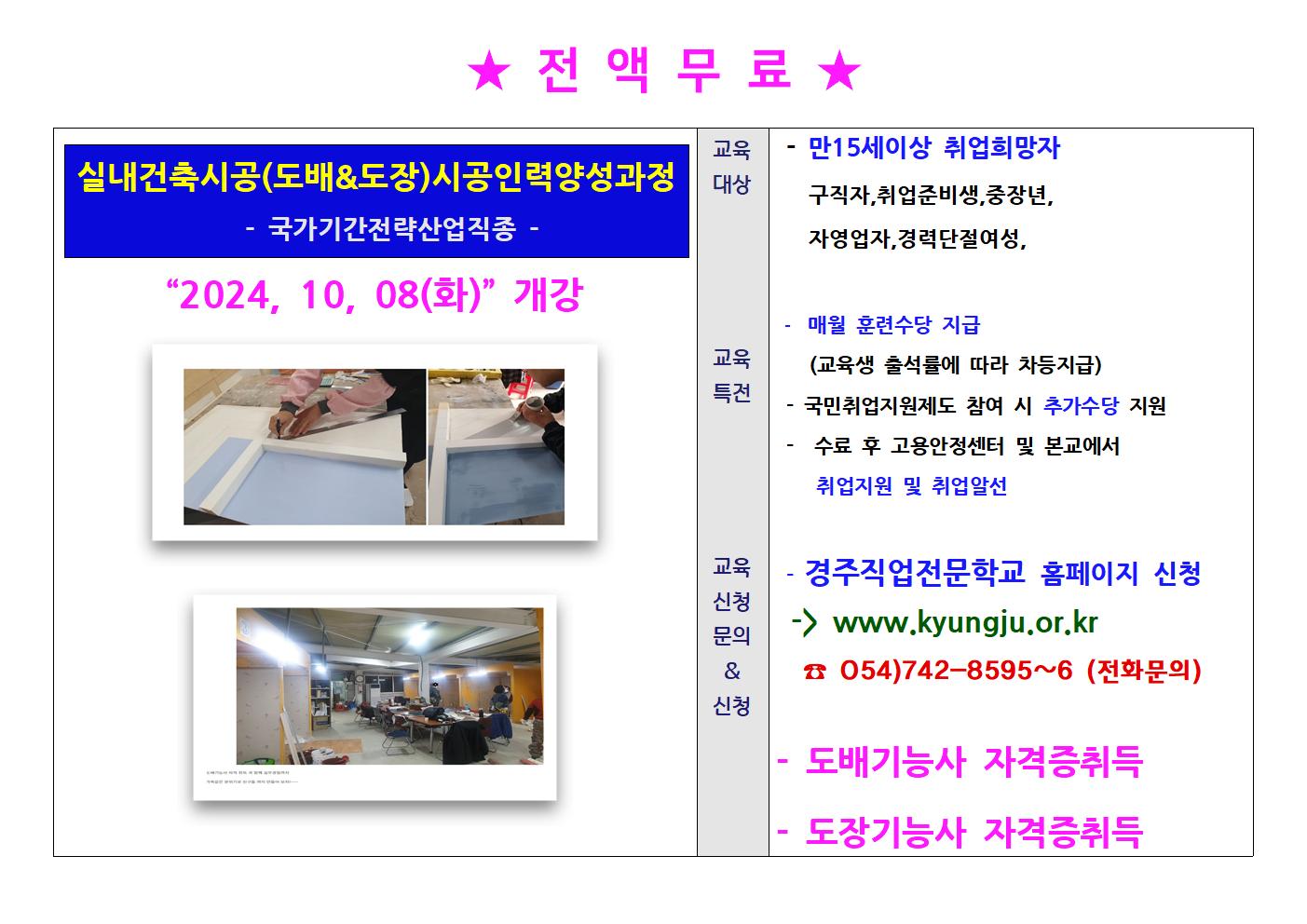 * 2024년 10월 8일 전액국비지원 실내건축(도배&도장)시공인력양성과정 개설!!